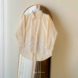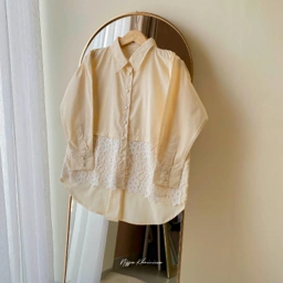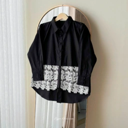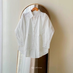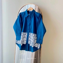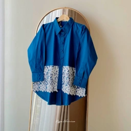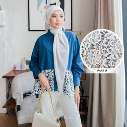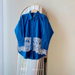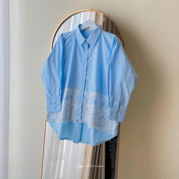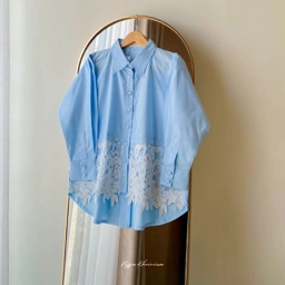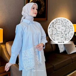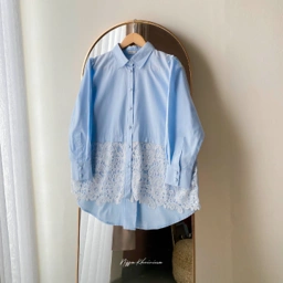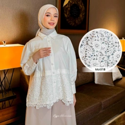 Kemeja berkerah dengan bahan Katun poplin ditambah brukat pada bagian depan baju dengan motif yang cantik-cantik. Bagian depan sudah full kancing bungkus dan bagian pergelangan juga dilengkapi kancing sehingga busui dan wudhu friendly. Setiap warna memiliki perbedaan bagian motif renda yg digunakan.