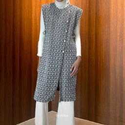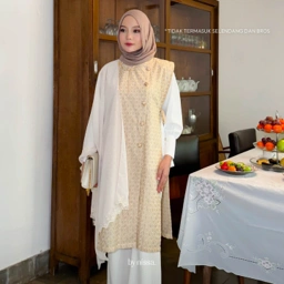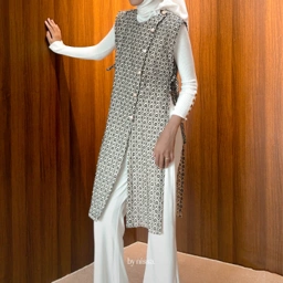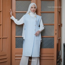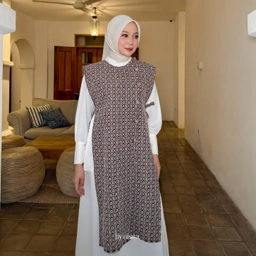 Outer dengan model tanpa lengan, memakai bahan katun bordir geometri, outer versi terbaru ini memiliki ciri khas 6 kancing berbentuk bunga warna gold di bagian samping kiri pakai dan Tali bagian samping kanan kiri yang bisa disesuaikan.