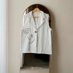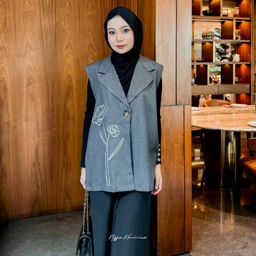 Kezia Vest model outer berkerah tanpa lengan dengan ciri khas bagian kiri pakai terdapat bordir bunga. Kezia Vest sudah dilengkapi 1 kancing bagian depan dan samping kanan kiri juga sudah dilengkapi tali ber-ring yg bisa di adjust memudahkan pemakaian.