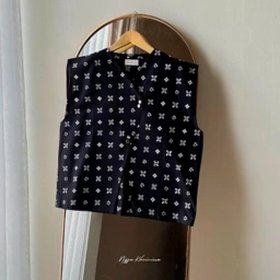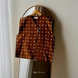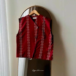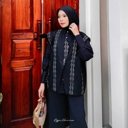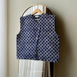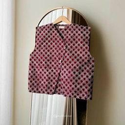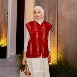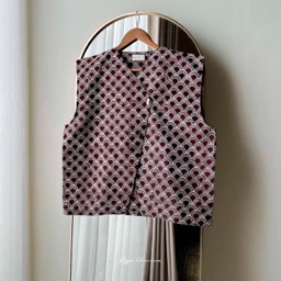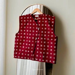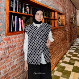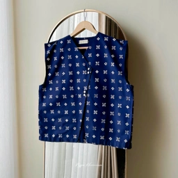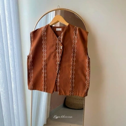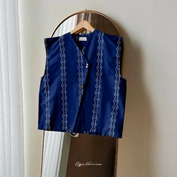 Outer dengan model tanpa lengan, memakai bahan katun bermotif batik. Model kerah V-Neck, memiliki kancing datar bagian depan.