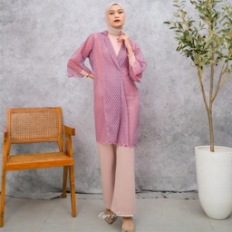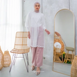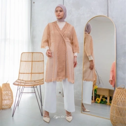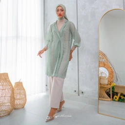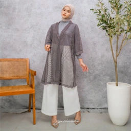 Outer dengan bahan lace diamond, bagian kerah model V-neck, dan kancing bagian depan membuat tampilan lebih rapi dan elegan.