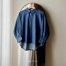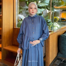 Megan Kemeja dengan bahan soft denim, cutting kemeja berkerah, dan sudah full kancing sehingga wudhu dan busui friendly.
