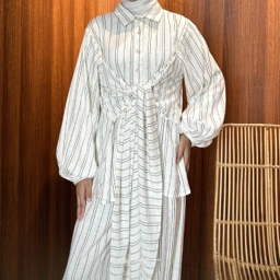 Calandra Kemeja berbahan katun stripe (bermotif garis-garis), model kemeja berkerah, sudah full kancing, bagian lengan agak puffy (menggembung/lengan balon), dan bagian pergelangan tangan juga sudah dilengkapi 1 kancing. Calandra Kemeja memiliki ciri khas yaitu adanya tambahan layer samping kanan kiri yang bisa ditalikan ke depan.