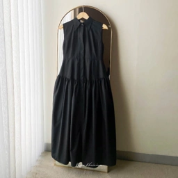 Lucia Dress tanpa lengan berbahan Cotton Fine, dengan model kerah kemeja, dilengkapi 13 kancing tertutup (Hidden Placket).