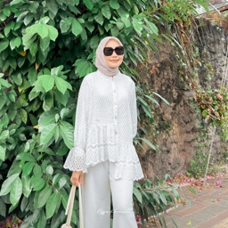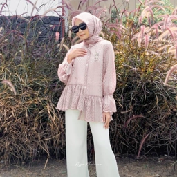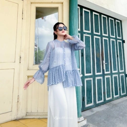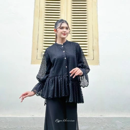 Blouse dengan bahan lace diamond dengan desain unik yaitu terdapat ruffle dibagian bawah yg asimetris dan dilengkapi dengan kancing membuat look blouse ini feminim