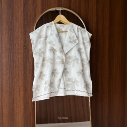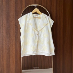 Esther Vest tanpa lengan berbahan linen bordir dengan motif bunga yang cantik, memiliki cutting kerah V-neck, dilengkapi 1 kancing bunga warna emas dan bagian samping kanan kiri terdapat belahan setinggi 20 cm menambah kenyamanan saat beraktivitas.