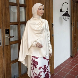 Rayadinata Blouse berbahan Golden Silk yang lembut dan jatuh saat dikenakan, memiliki model high neck (kerah tinggi) yang tegak dilengkapi selendang yang menjuntai di bagian kanan depan memberikan kesan elegant pemakai. Rayadinata Blouse pada bagian bahu sisi kiri pakai terdapat lipit yang dipercantik kancing emas bunga dan bagian lengan juga sudah dilengkapi resleting sehingga wudhu friendly.