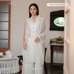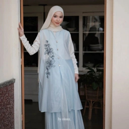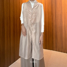 Poetry Long Vest tanpa lengan berbahan soft glasse dipercantik bordir bunga pada bagian sisi kanan pakai, memiliki ciri khas cutting kerah setali (kerah yang dijahit menyatu dengan garis leher), bagian depan sudah dilengkapi kancing, dan bagian samping kanan kiri terdapat belahan memudahkan pemakaian.