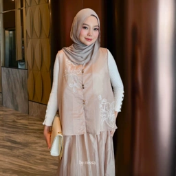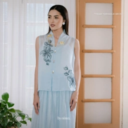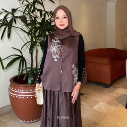 Nonna Vest tanpa lengan berbahan soft glasse memiliki ciri khas cutting kerah setali (kerah yang dijahit menyatu dengan garis leher), bagian kanan atas dan kiri bawah dipercantik bordir bunga khas by.nissakhoirina. Nonna Vest sudah dilengkapi 6 buah kancing dan bagian sisi kanan kiri juga terdapat belahan setinggi 22 cm memberikan kenyamanan pemakai saat beraktivitas.